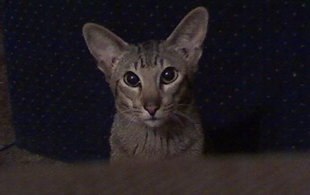 Haus, she runs after KB...and they can rumble the floors too....try hardwood! Smooch and Boo were/are mean to her, so she won't play with KB because everytime he tries, she's afraid she's gonna get hurt...however, she is now getting back at the 2 terrors.....she like to sneak up on them and either whack them or scare them.....she thinks it's hilarious when they jump, foof, hiss and spit at her. She stands there and just looks at them like "THERE, DAMMIT! Payback's a bitch!" But she also runs around chasing the imaginary things that only cats see......and she can rumble the floor all by her lonesome! She's not exactly a lightweight! But I would never tell her that....wouldn't want to give her body issues! Raiikun, yours is a beauty too! What a little face! And those ears......what kind of kitteh is it? Right now Boo is chasing something around...not quite sure what it is, but I'd better go check...it sounds a little bigger than his pistachio nuts......and there's just been a *crash* from the kitchen....brb....