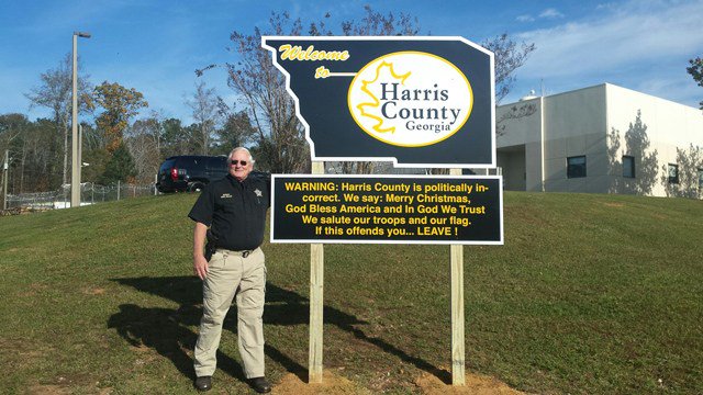 "Welcome to Harris County, Georgia! WARNING: Harris County is politically incorrect. We say: Merry Christmas, God Bless America and In God We Trust; We salute our troops and our flag. If this offends you… LEAVE!"